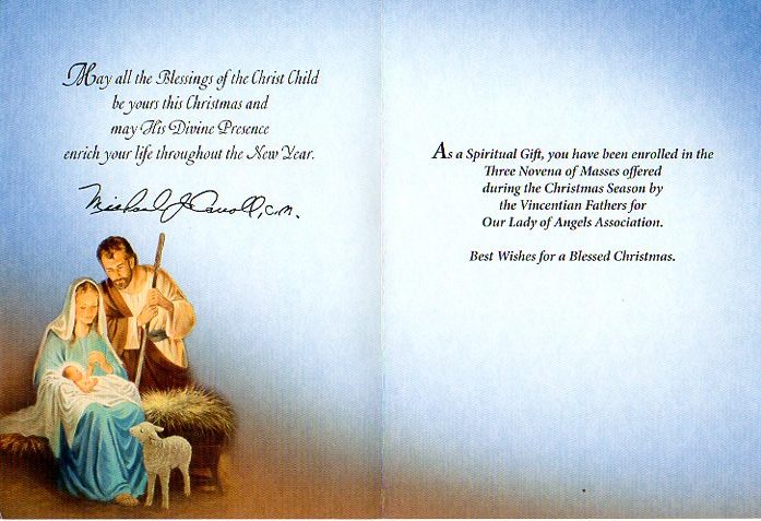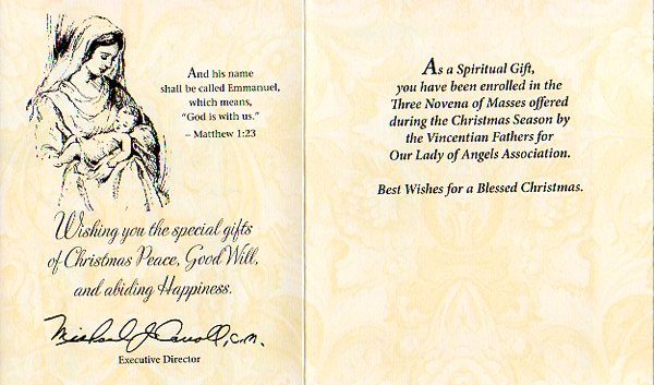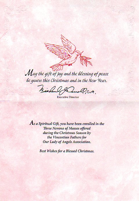 Give a spiritual gift and enroll yourself and/or loved ones in the Three Novenas of Masses offered during the Christmas Season by the Vincentian Fathers for Our Lady of Angels Association.